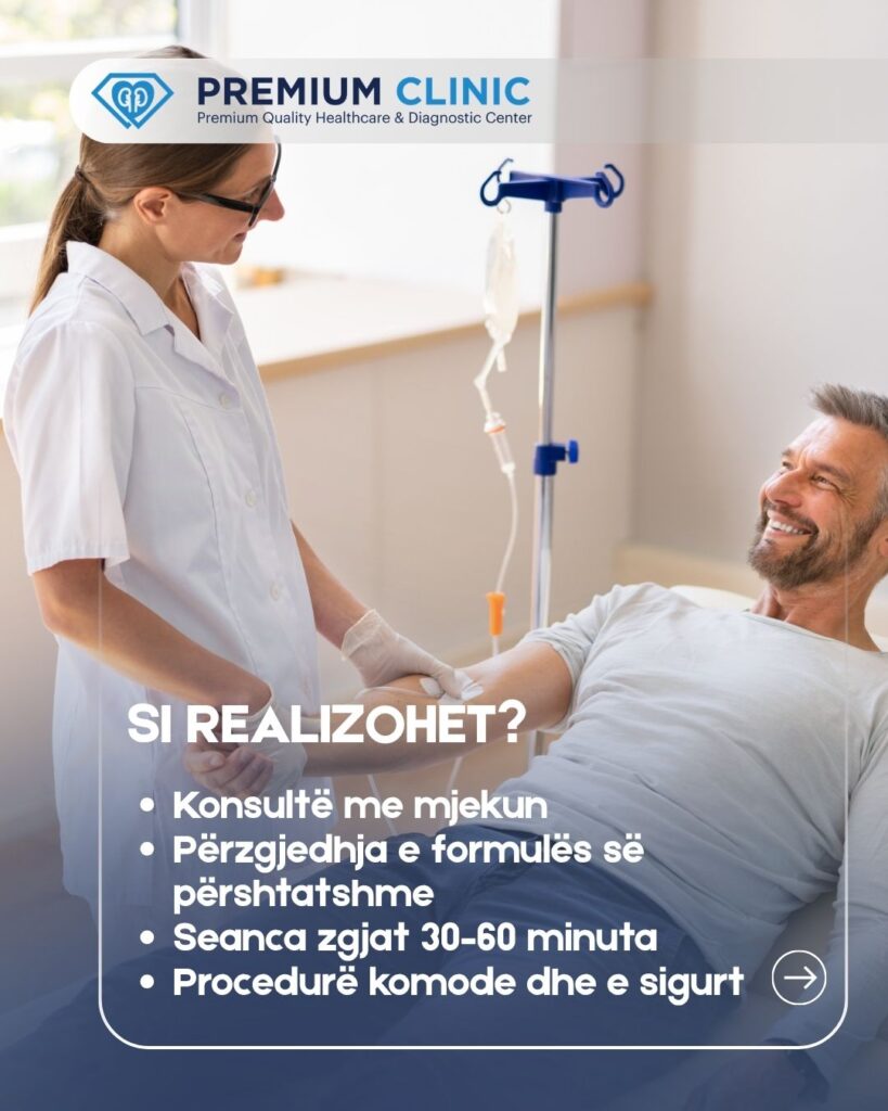 Në Premium Clinic të gjithë qytetarët paraprakisht që kanë dëshirë të forcojnë imunitetin e tyre ose të rrisin mirëqënien së pari i nënshtrohen një konsulte me mjekët e klnikës për të evidentuar saktësisht problematikat shëndetësore të tyre. Nëse mjekët e konsiderojnë të nevojshme ata kryejnë edhe analizat specifike të rekomanduara nga ana e mjekëve dhe më pas i mund të kryejnë Terapinë IV për të rritur mirëqënien e tyre.